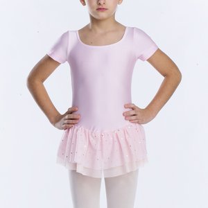 Short sleeve leotard with attached mesh and sequin double layer skirt.