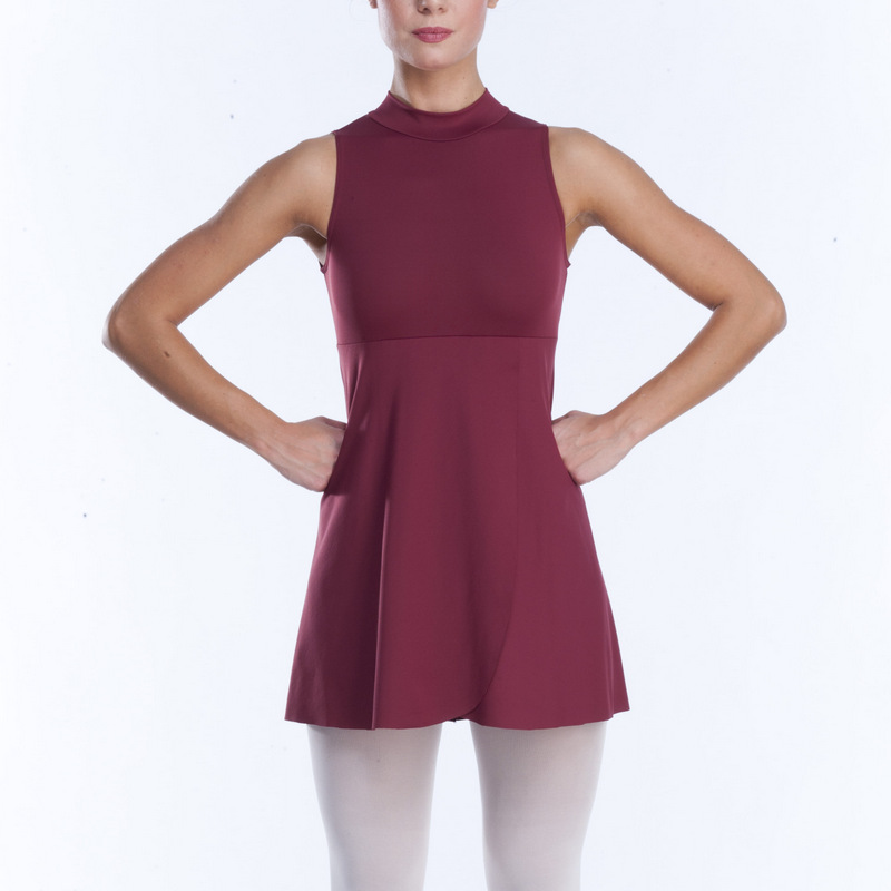 Sleeveless turtleneck and keyhole back leotard with attached skirt for ballet and modern dance. Available in a selection of colors.