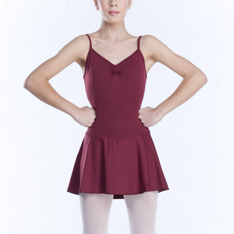 Abitino bretellina con fianchetti, arriccio al centro davanti, gonnellino inserito nel taglio, fodera a richiesta, per danza classica e moderna, disponibile in diversi colori.