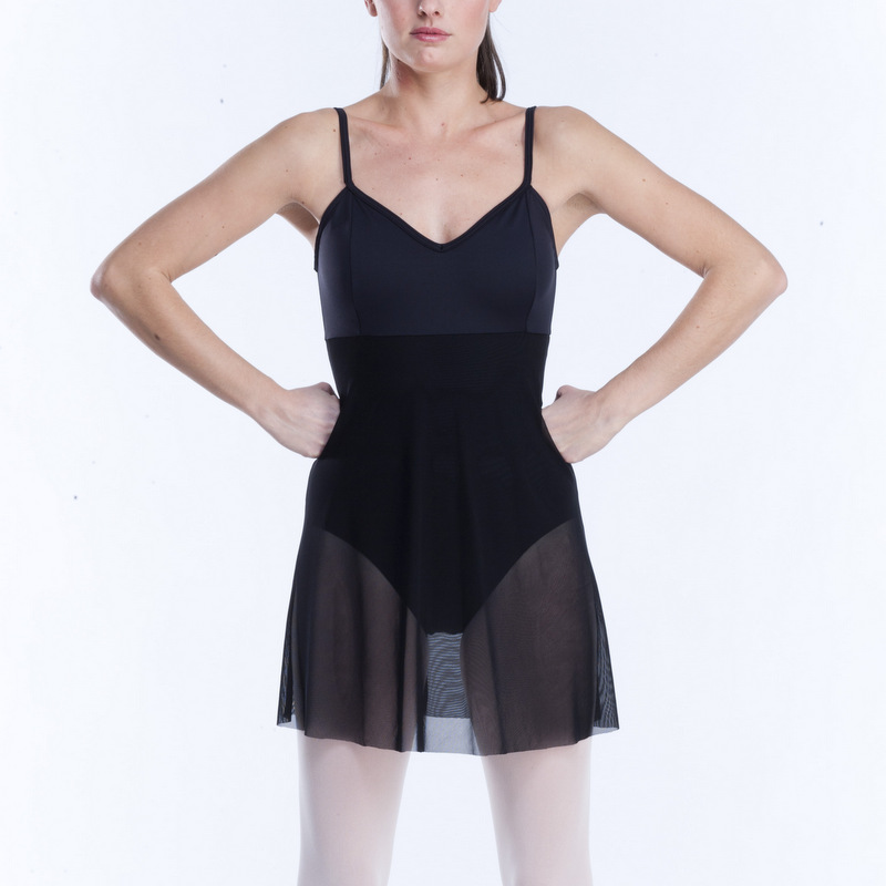 Abitino bretellina in lycra con gonnellino in tulle elast. e body incorporato con parte superiore foderata, per danza classica e moderna, disponibile in diversi colori.