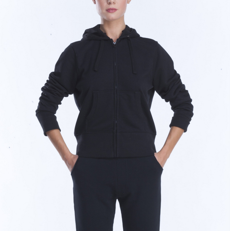 Giacca in felpa con tasca a marsupio, zip davanti e cappuccio.