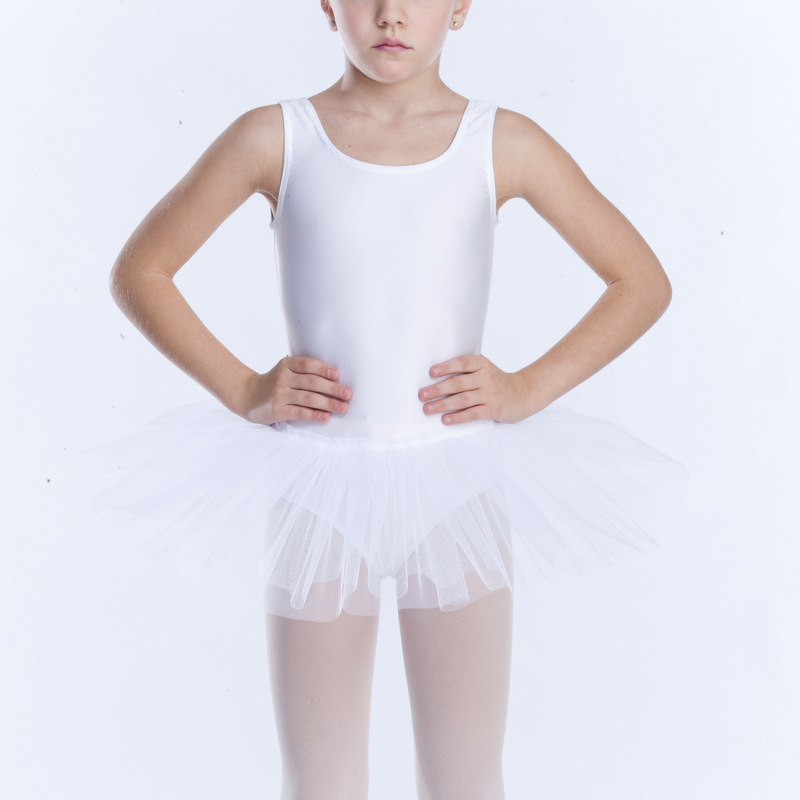 Tutù bimba per danza classica con body a canotta e due balze in tulle rigido, disponibile in diversi colori.